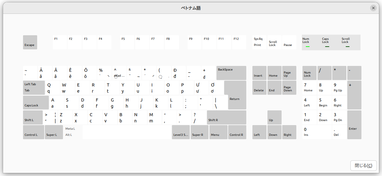 Ubuntu 22.04 LTSの場合、設定の「キーボード」で入力ソースの一番下にある+を押してベトナム語を探す。何もつかない「ベトナム語」を選択するとWindows方式になる。「ベトナム語 (Unikey)」を選ぶと設定でTELEXまたはVNIの入力モードになる。