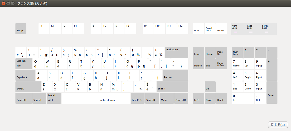 Ubuntu 16.04 LTSの場合、システム設定の[テキスト入力]で、左下の「+」ボタンをクリックして「入力ソースの選択」ウインドウを表示させる。その下部にある検索ウインドウに「フランス語」を入力し、表示された候補リスト中の「フランス語(カナダ)」または「英語(国際AltGrデッドキー)」を選択して右下にある「追加(A)」ボタンをクリックして追加。キーボードレイアウトは以下の通り。右下は右Altと一緒に、右上は右Alt、Shiftと一緒に押して入力。